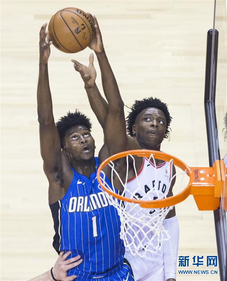 猛龙队球员安纳诺比(右)与魔术队球员乔纳森·艾萨克在比赛中争抢篮板球。新华社发(邹峥摄)