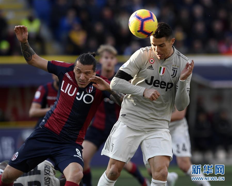 2月24日,尤文图斯队球员克·罗纳尔多(右)与博洛尼亚队球员桑坦德争顶。 当日,在2018-2019赛季意大利足球甲级联赛第25轮比赛中,尤文图斯队客场以1比0战胜博洛尼亚队。 新华社发
