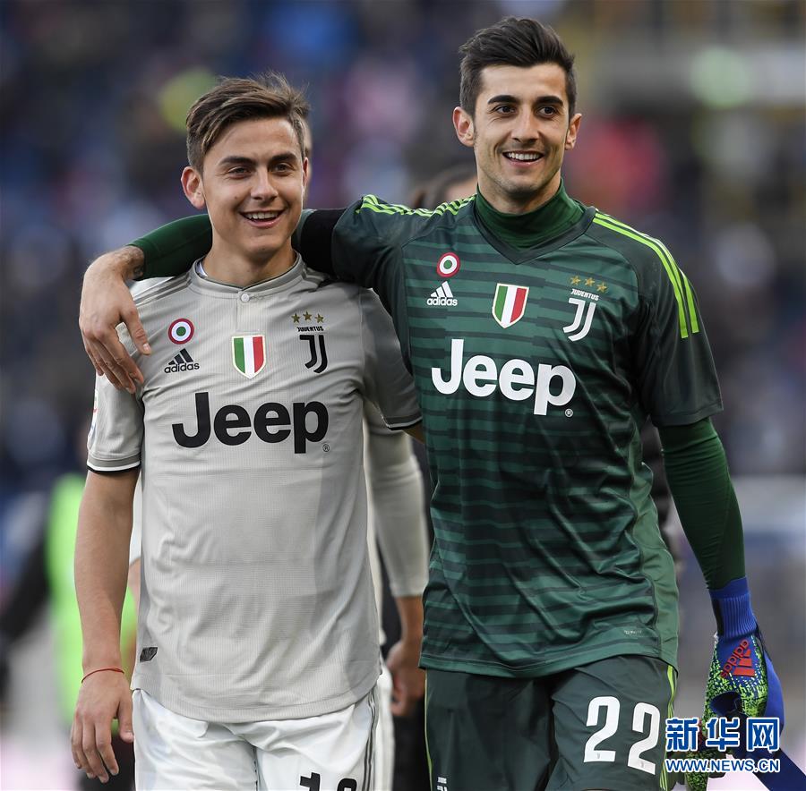 尤文图斯队球员迪巴拉(左)与守门员佩林在赛后庆祝。新华社发