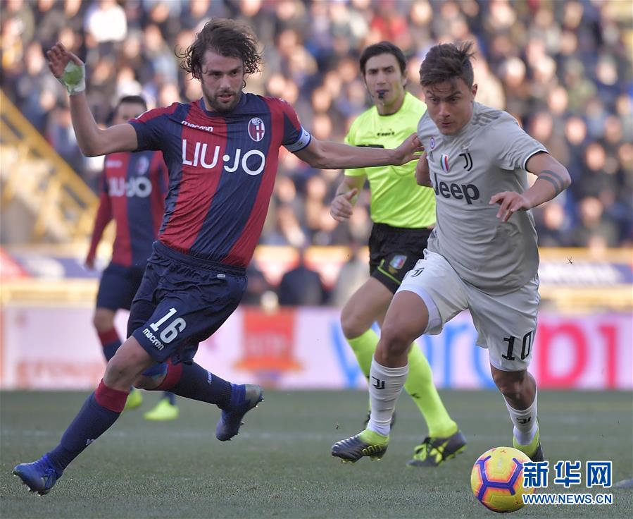 尤文图斯队球员迪巴拉(右)与博洛尼亚队球员波利在比赛中拼抢。新华社发