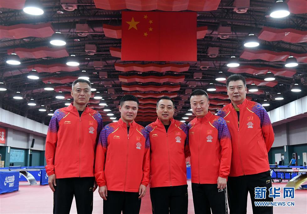 2月25日,中国乒乓球协会主席刘国梁(中)与国家乒乓球队男队主教练秦志戬(左一)、男一队组长刘国正(左二)、女队主教练李隼(右一)、女一队组长马琳合影。 新华社记者陶希夷摄