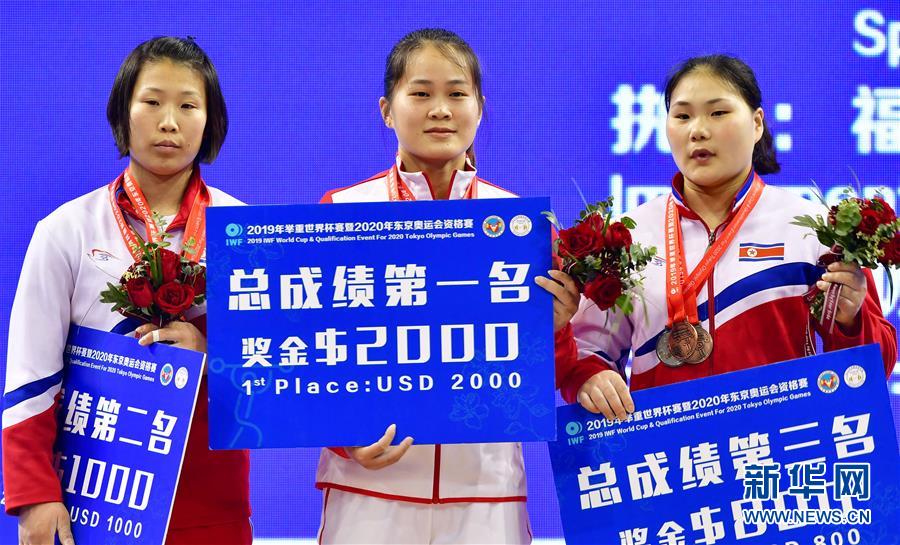2月25日,邓薇(中)在女子64公斤级颁奖仪式上。 当日,在福州市举行的2019年举重世界杯赛暨东京奥运会资格赛女子64公斤级决赛中,中国选手邓薇以抓举113公斤、挺举141公斤、总成绩254公斤的成绩夺得该级别抓举、挺举和总成绩三项冠军,并打破抓举、挺举和总成绩三项世界纪录。 新华社记者魏培全摄