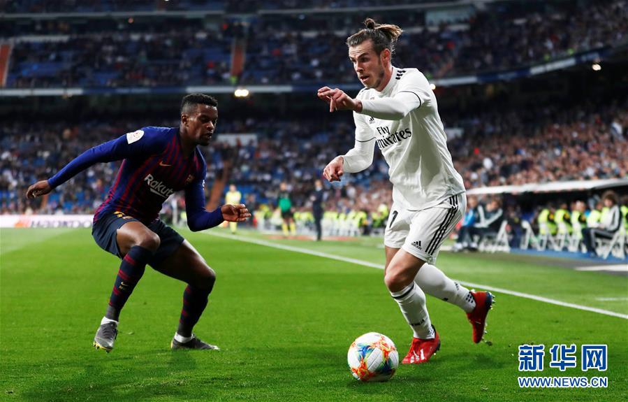 2月27日,皇家马德里队球员贝尔(右)带球突破巴塞罗那队球员塞梅多。 当日,在2018-2019赛季西班牙国王杯足球赛半决赛次回合比赛中,巴塞罗那队客场以3比0战胜皇家马德里队,从而以4比1的总比分晋级决赛。 新华社/路透社