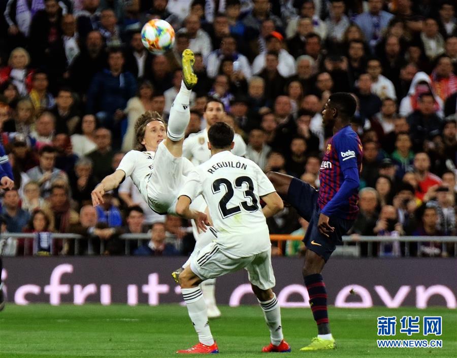 2月27日,皇家马德里队球员莫德里奇(左一)在比赛中拼抢。 当日,在2018-2019赛季西班牙国王杯足球赛半决赛次回合比赛中,皇家马德里队主场以0比3不敌巴塞罗那队,从而以1比4的总比分无缘决赛。 新华社发