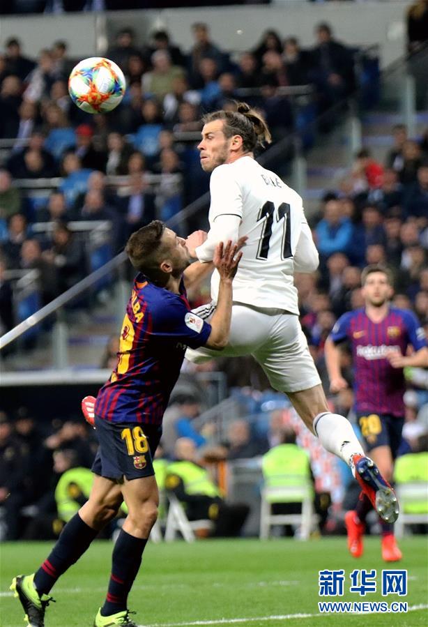 皇家马德里队球员贝尔(右)和巴塞罗那队球员阿尔巴在比赛中争顶。新华社发