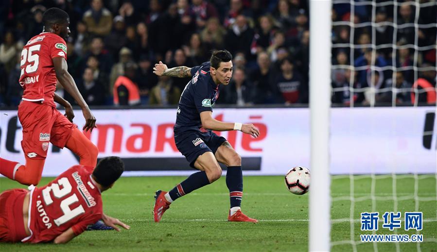 巴黎圣日耳曼队球员迪马利亚(右)在比赛中破门得分。新华社/法新社