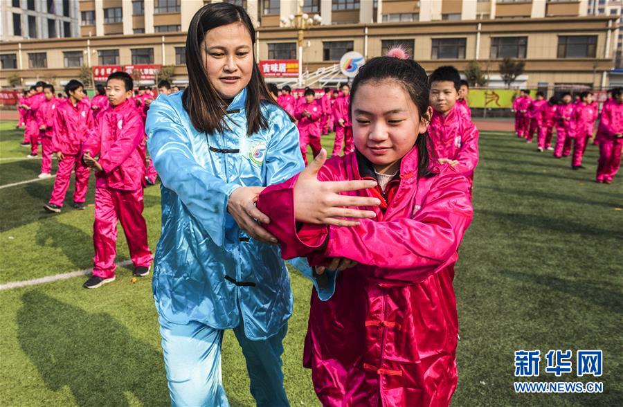 3月1日,河北省枣强县第五小学的学生在老师指导下练习太极拳。 近年来,河北省枣强县第五小学把太极文化融入素质教育,编写太极校本教材,开设太极功夫课,建立太极功夫兴趣社团,传承和弘扬中华传统文化。 新华社记者李晓果摄