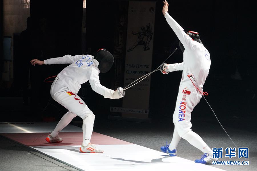 3月1日,中国队选手许庭玮(左)与韩国队选手秋显镇在决赛中。当日,在约旦萨勒特市进行的2019年亚洲青年击剑锦标赛少年组男子重剑团体决赛中,中国队以45比30战胜韩国队,获得冠军。新华社记者 林晓蔚 摄