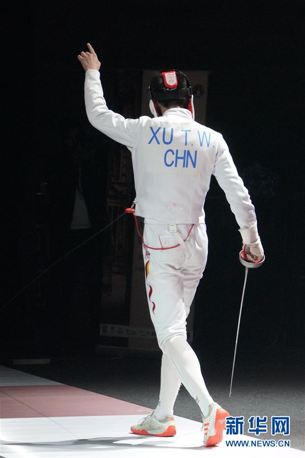 3月1日,中国队选手许庭玮在决赛中庆祝得分。当日,在约旦萨勒特市进行的2019年亚洲青年击剑锦标赛少年组男子重剑团体决赛中,中国队以45比30战胜韩国队,获得冠军。新华社记者 林晓蔚 摄