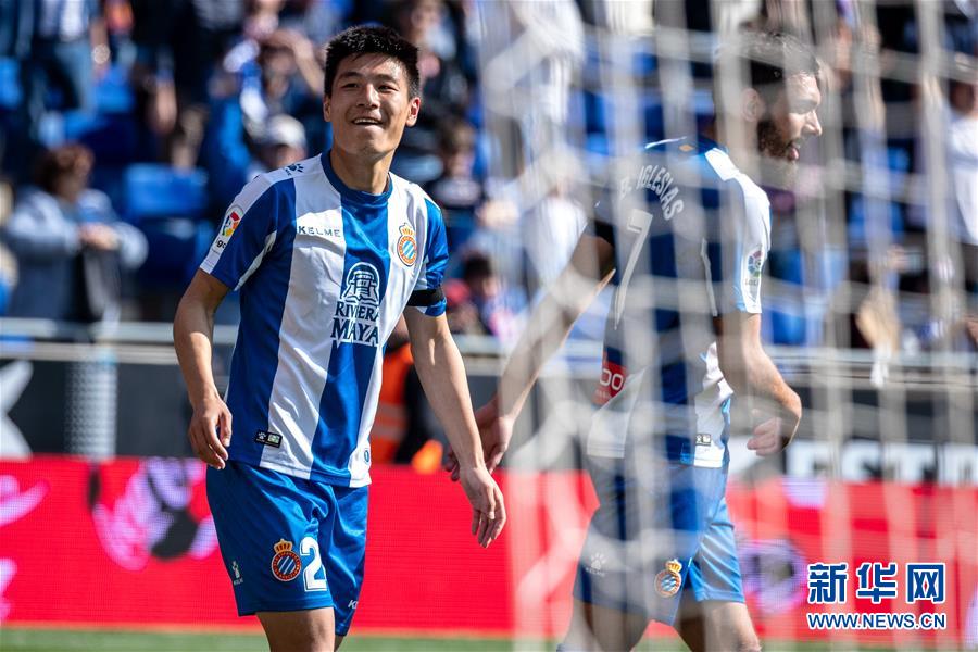 3月2日,西班牙人队球员武磊(左)在比赛中庆祝自己在西甲的首粒进球。 当日,在2018-2019赛季西班牙足球甲级联赛第26轮比赛中,西班牙人队主场以3比1战胜巴拉多利德队。中国球员武磊在本场比赛中攻入一球,收获自己在西甲联赛的首粒进球。 新华社发(胡安·戈萨摄)