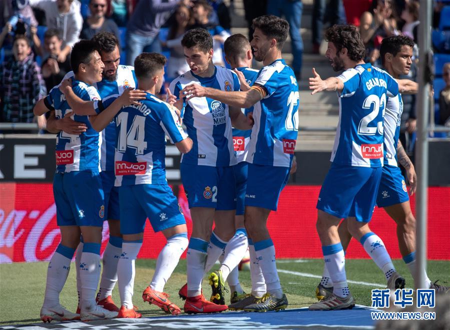 3月2日,西班牙人队球员武磊(左一)进球后与队友庆祝。 当日,在2018-2019赛季西班牙足球甲级联赛第26轮比赛中,西班牙人队主场以3比1战胜巴拉多利德队。中国球员武磊在本场比赛中攻入一球,收获自己在西甲联赛的首粒进球。 新华社发(胡安·戈萨摄)