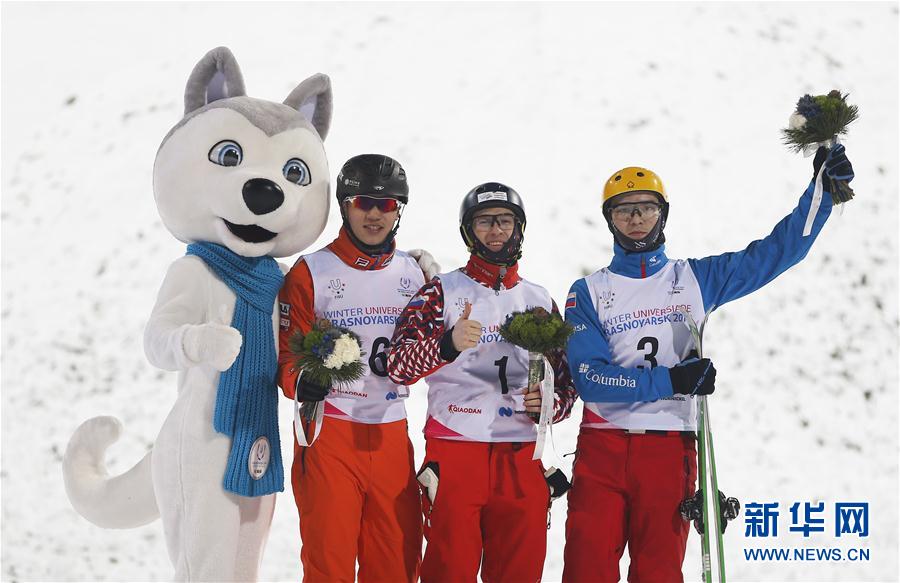 3月3日,中国选手李忠霖(右三)在献花仪式上。 当日,在俄罗斯克拉斯诺亚尔斯克举行的第29届世界大学生冬季运动会自由式滑雪空中技巧男子组决赛中,中国选手李忠霖以87.77分的成绩获得银牌。 新华社记者王东震摄