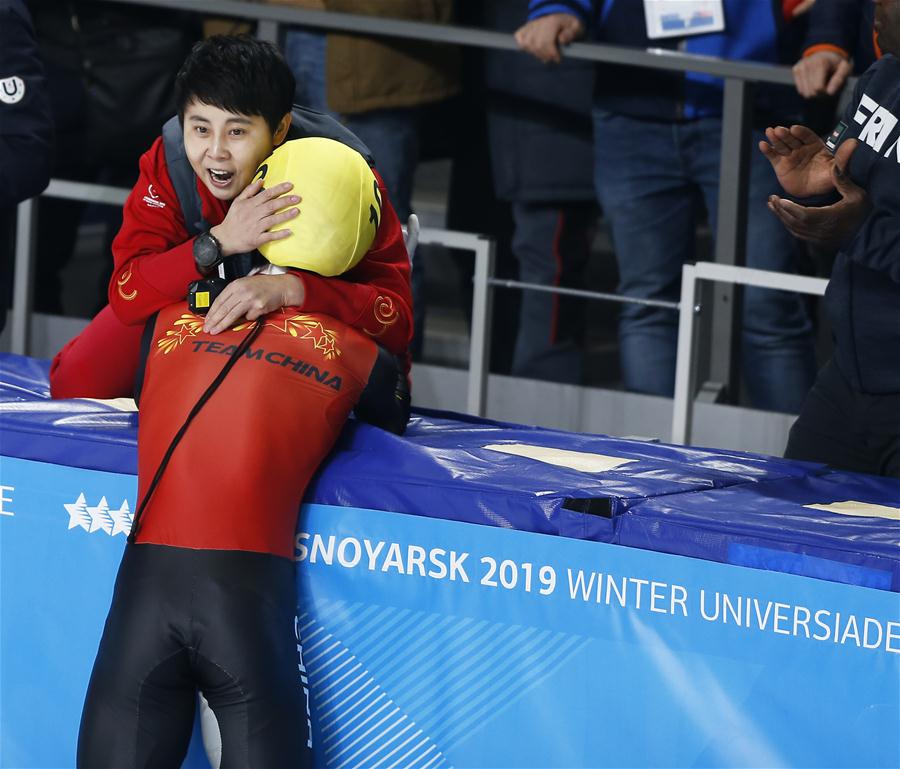 3月4日,中国选手安凯(前)和主教练王濛在比赛后庆祝。 当日,在俄罗斯克拉斯诺亚尔斯克进行的第29届世界大学生冬季运动会短道速滑男子1500米决赛中,中国选手安凯以2分34秒350的成绩获得冠军,这也是中国代表团在本届大冬会上夺得的首枚金牌。 新华社记者王东震摄