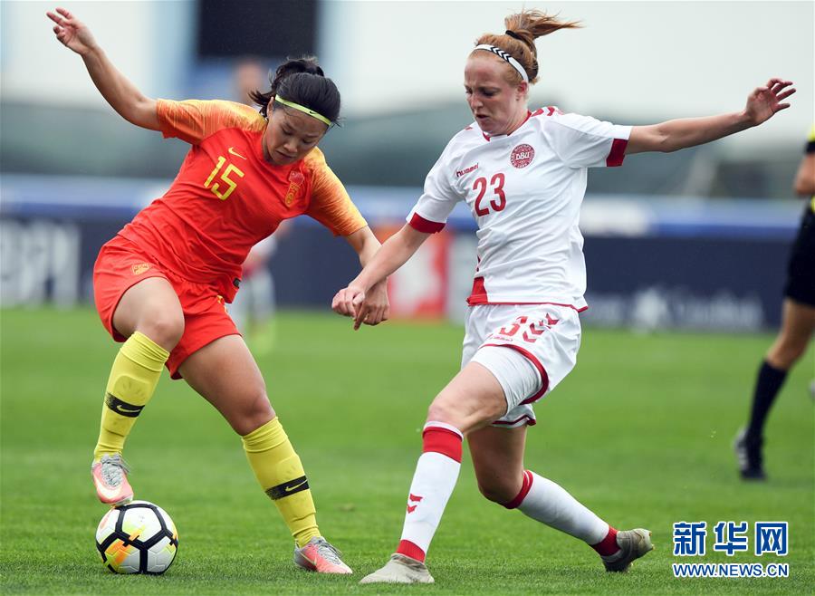 3月4日,中国队球员肖裕仪(左)与丹麦队球员卡伦·霍尔姆高在比赛中拼抢。 当日,在葡萄牙圣安东尼奥举行的2019阿尔加夫杯国际女足邀请赛C组比赛中,中国队以0比1不敌丹麦队。 新华社记者张立云摄