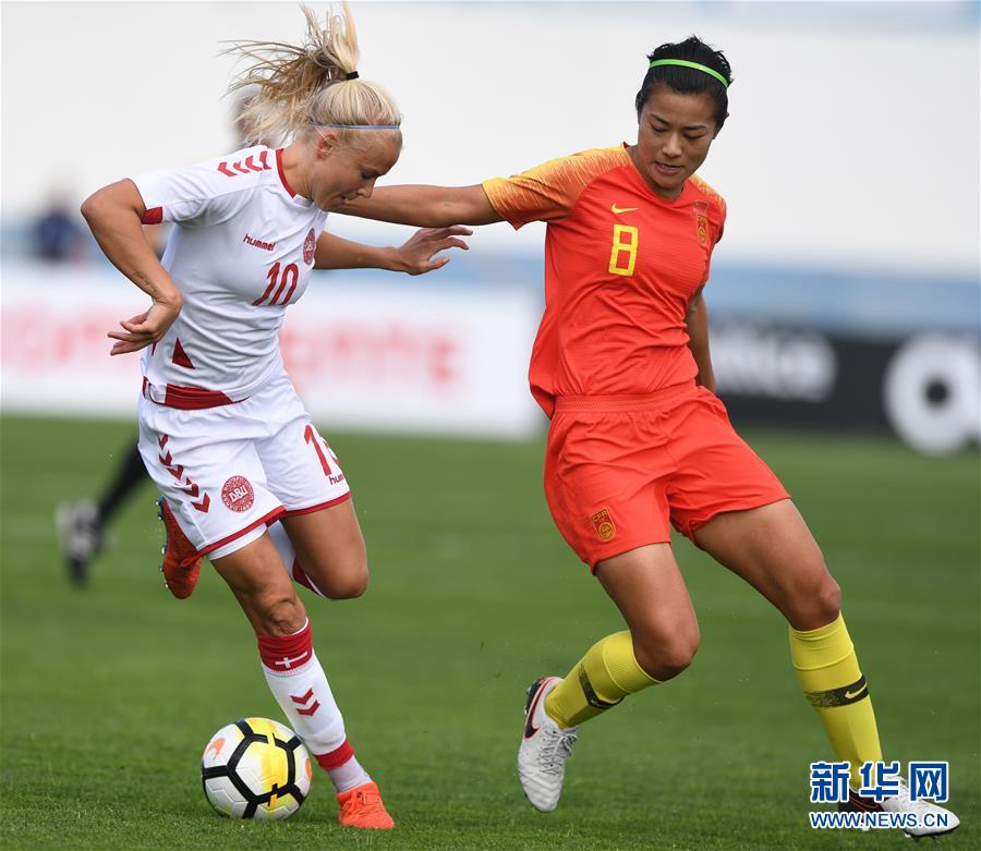 中国队球员李佳悦(右)与丹麦队球员哈德在比赛中拼抢。新华社记者张立云摄