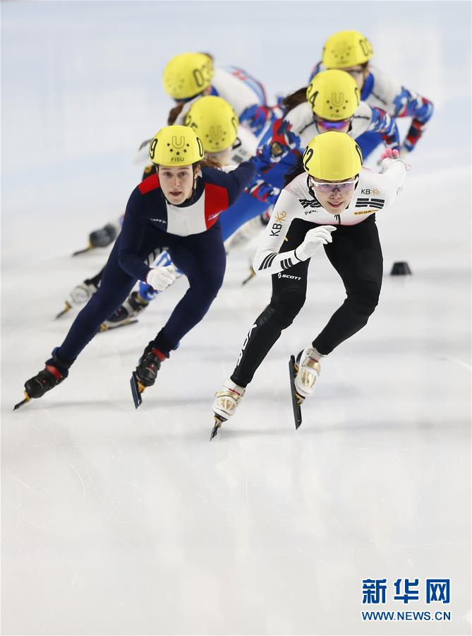 3月4日,金雅朗(前右)在比赛中。 当日,在俄罗斯克拉斯诺亚尔斯克进行的第29届世界大学生冬季运动会短道速滑女子1500米决赛中,韩国选手金雅朗以2分38秒363的成绩夺冠。 新华社记者王东震摄