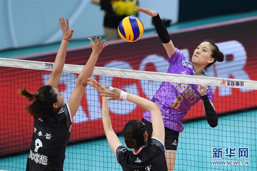 3月2日,天津渤海队球员郑益昕(右一)在比赛中扣球。 当日,在2018-2019赛季中国女排超级联赛决赛第二场比赛中,北京汽车队主场以3比1战胜天津渤海队,以2比0的总比分暂时领先。 新华社记者鞠焕宗摄