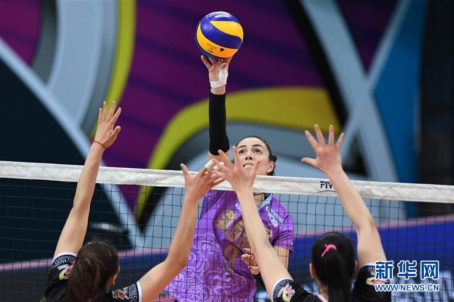 3月2日,天津渤海队球员茨尔恩切维奇(中)在比赛中扣球。 当日,在2018-2019赛季中国女排超级联赛决赛第二场比赛中,北京汽车队主场以3比1战胜天津渤海队,以2比0的总比分暂时领先。 新华社记者鞠焕宗摄