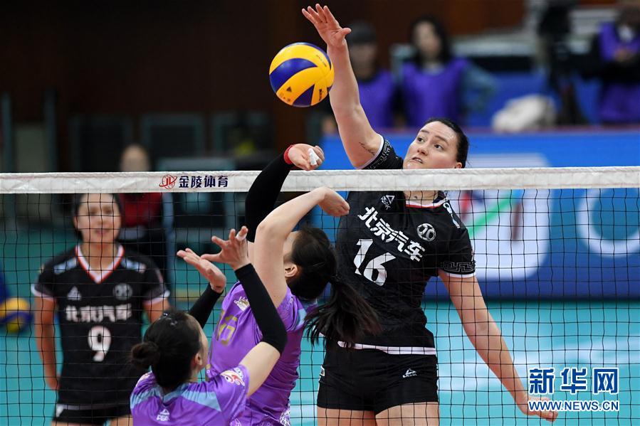 3月2日,北京汽车队球员迪克森(右一)在比赛中扣球。 当日,在2018-2019赛季中国女排超级联赛决赛第二场比赛中,北京汽车队主场以3比1战胜天津渤海队,以2比0的总比分暂时领先。 新华社记者鞠焕宗摄