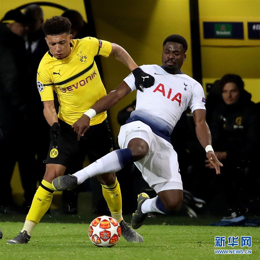 3月5日,多特蒙德队球员桑乔(左)在比赛中与托特纳姆热刺队球员奥里耶拼抢。 当日,在德国多特蒙德举行的2018-2019赛季欧冠联赛八分之一决赛次回合比赛中,英超托特纳姆热刺队客场以1比0战胜德甲多特蒙德队,以总比分4比0晋级下一轮。 新华社发