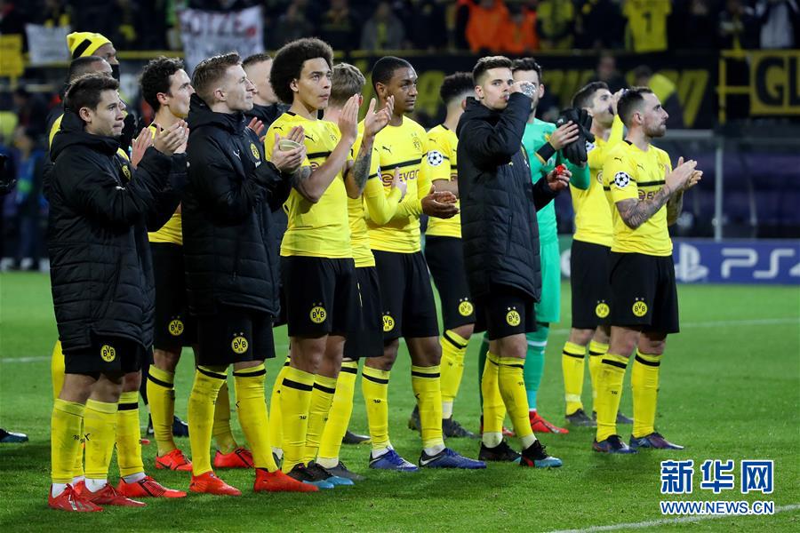 多特蒙德队球员在比赛后向球迷致意。 当日,在德国多特蒙德举行的2018-2019赛季欧冠联赛八分之一决赛次回合比赛中,英超托特纳姆热刺队客场以1比0战胜德甲多特蒙德队,以总比分4比0晋级下一轮。 新华社发