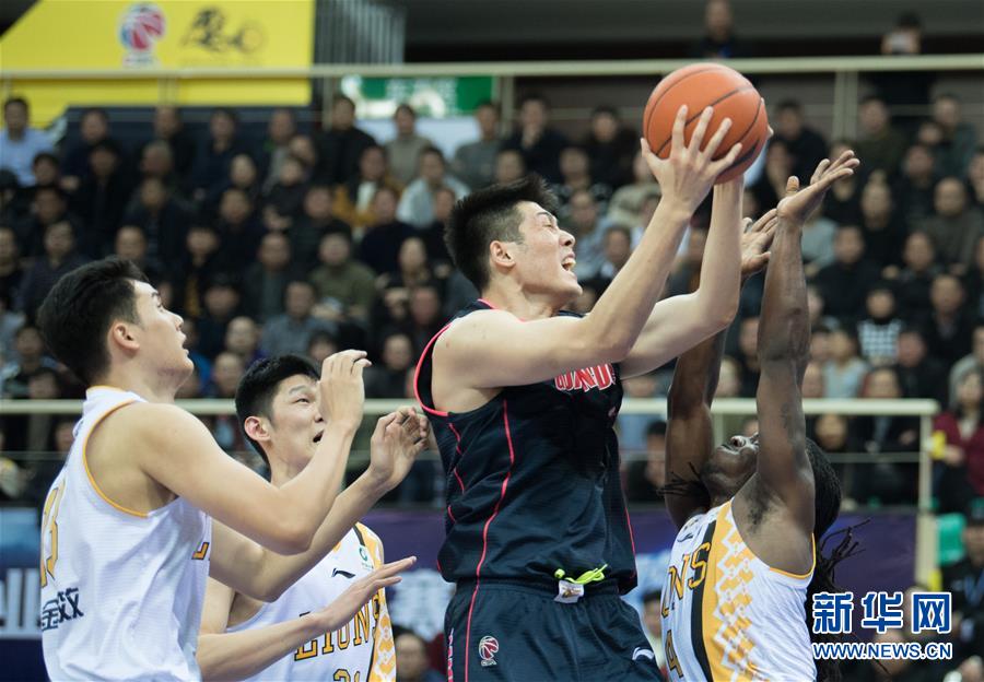 3月5日,广东东莞银行队球员任骏飞(右二)在比赛中突破上篮。 新华社记者翁忻旸摄