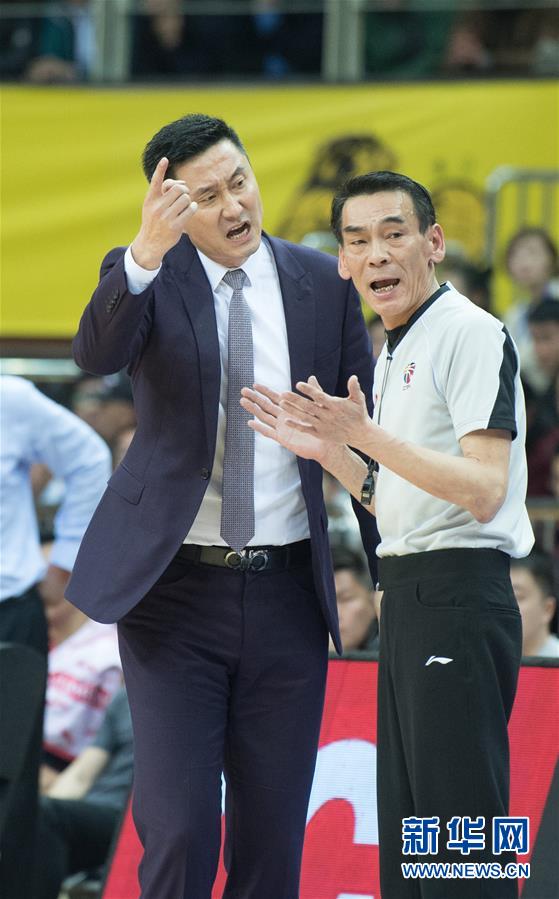 广东东莞银行队主教练杜锋(左)在场边与裁判交流。新华社记者翁忻旸摄