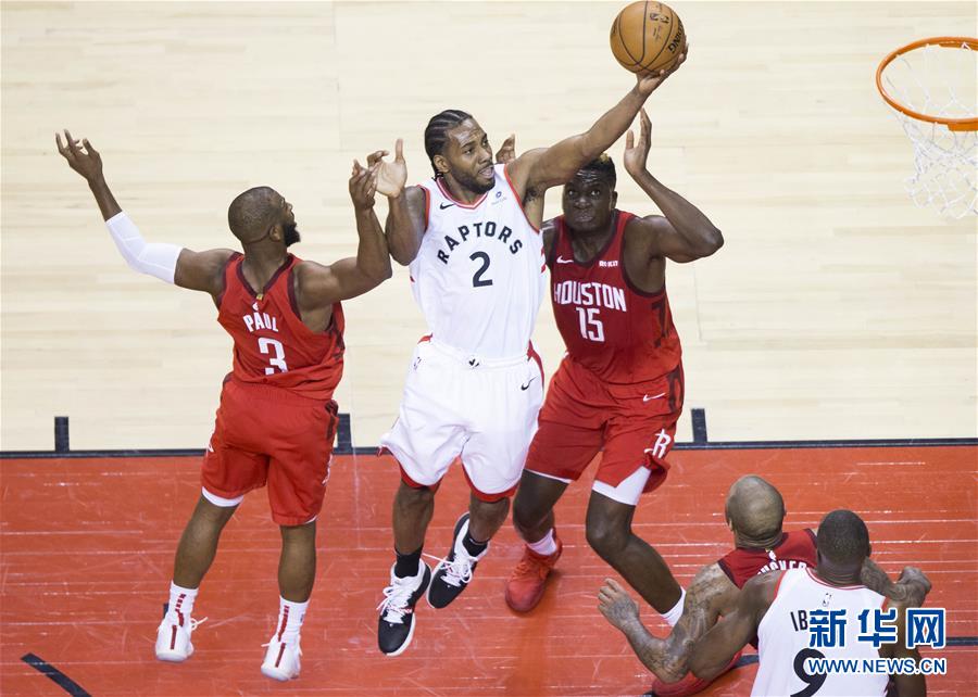 3月5日,猛龙队球员莱昂纳德(左二)在比赛中上篮。 当日,在2018-2019赛季NBA常规赛中,多伦多猛龙队主场以95比107不敌休斯顿火箭队。 新华社发(邹峥摄)