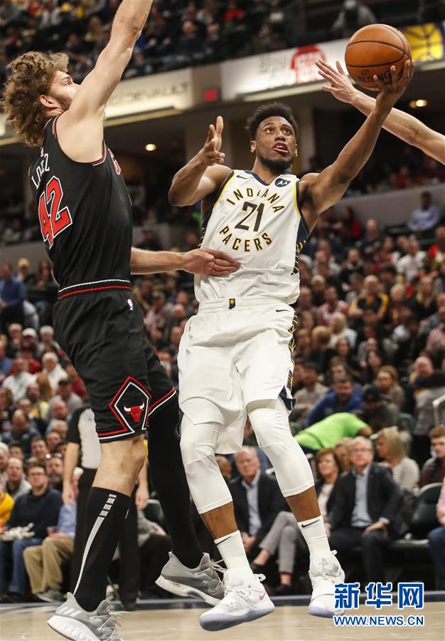 步行者队球员赛迪斯·杨(右)在比赛中运球上篮。新华社发