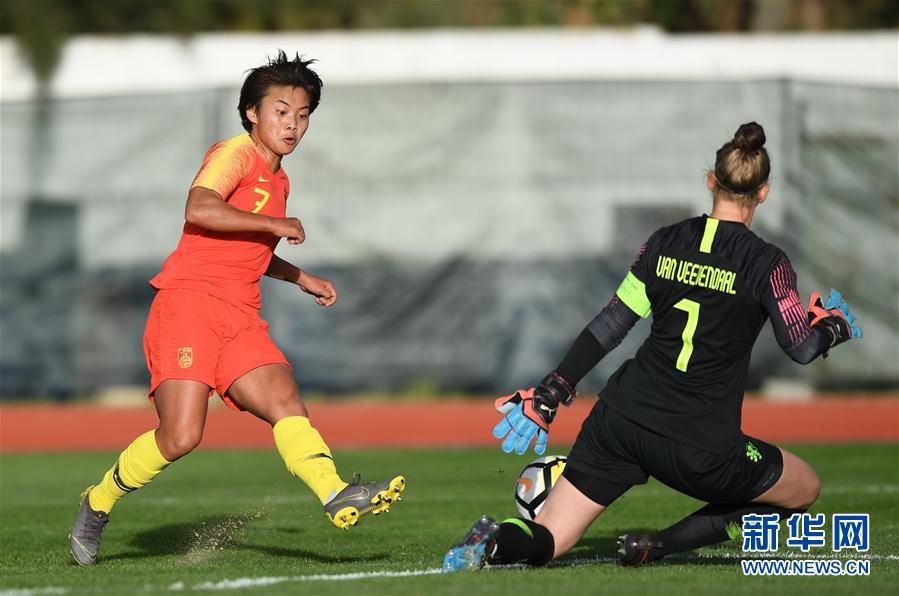 3月6日,中国队球员王霜(左)在比赛中射门。 当日,在2019阿尔加夫杯国际女足邀请赛第11和第12名排位赛中,中国队在90分钟内1比1战平荷兰队,经过点球大战,最终以3比5的总比分负于对手。 新华社记者张立云摄