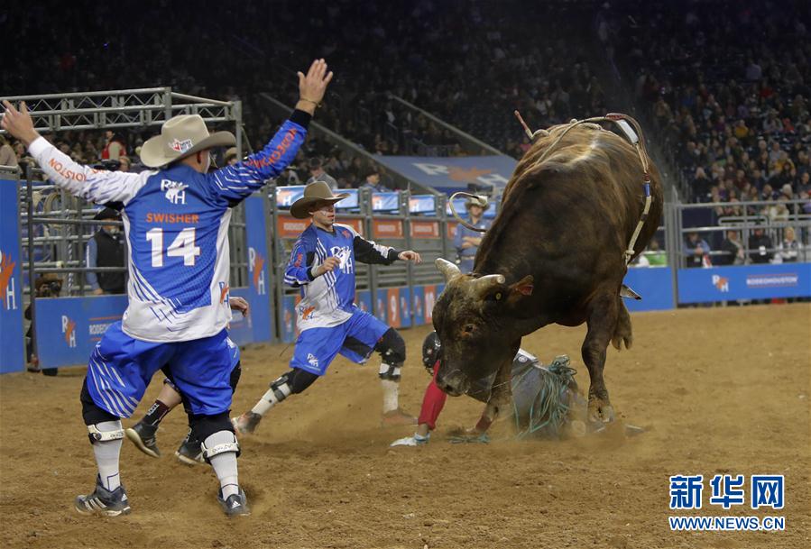3月6日,工作人员保护从牛背摔下的牛仔。 当日,2019年休斯敦牛仔节进行了骑马、骑牛等比赛,精彩激烈的场面令观众大饱眼福。 新华社发(宋穹摄)