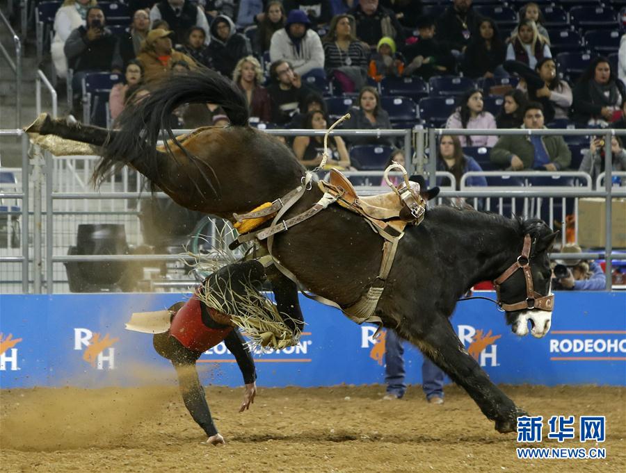 3月6日,一名牛仔在骑马比赛中摔下马背。 当日,2019年休斯敦牛仔节进行了骑马、骑牛等比赛,精彩激烈的场面令观众大饱眼福。 新华社发(宋穹摄)