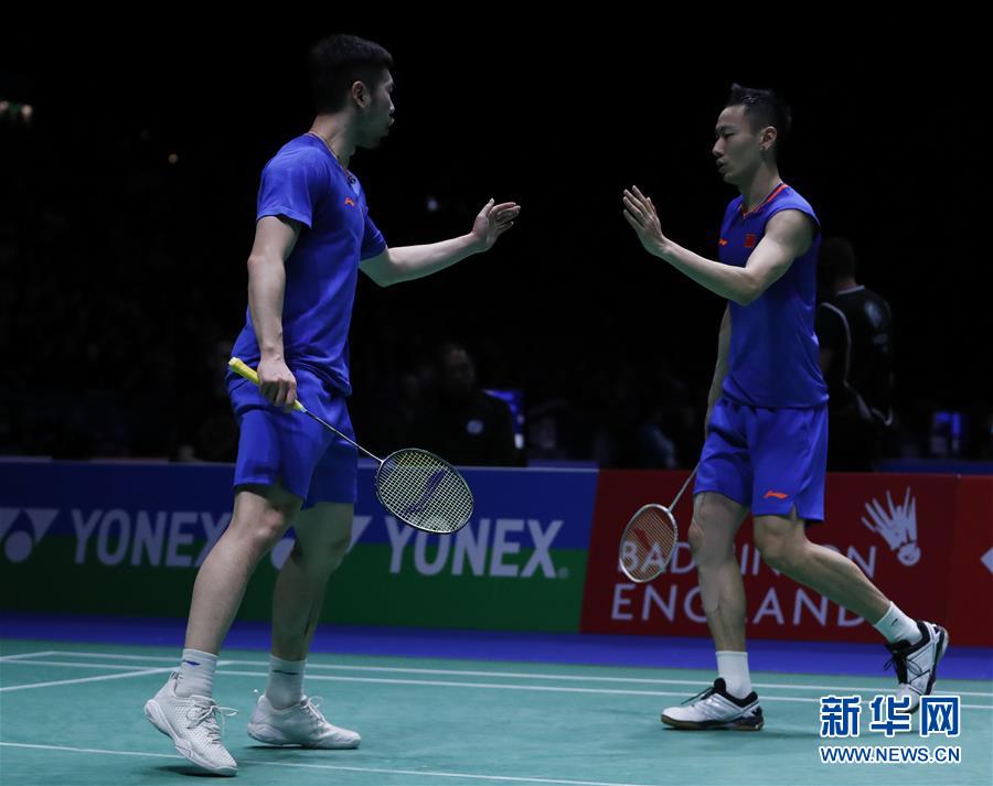 3月7日,刘成/张楠(右)在比赛中庆祝得分。 当日,在英国伯明翰进行的2019全英羽毛球公开赛男双第二轮比赛中,中国选手刘成/张楠以2比1战胜中国台北选手李洋/王齐麟,晋级八强。 新华社记者韩岩摄