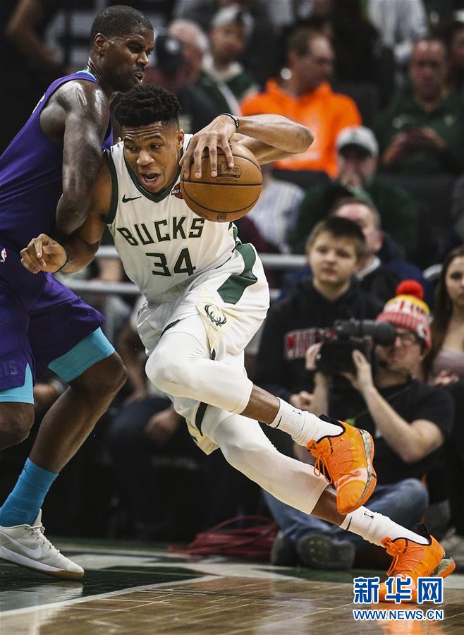雄鹿队球员安特托昆博(右)在比赛中带球进攻。新华社发