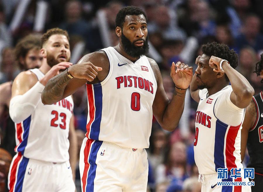 3月10日,活塞队球员德拉蒙德(中)在比赛中与队友们庆祝。 当日,在2018-2019赛季NBA常规赛中,底特律活塞队主场以131比108战胜芝加哥公牛队。 新华社发
