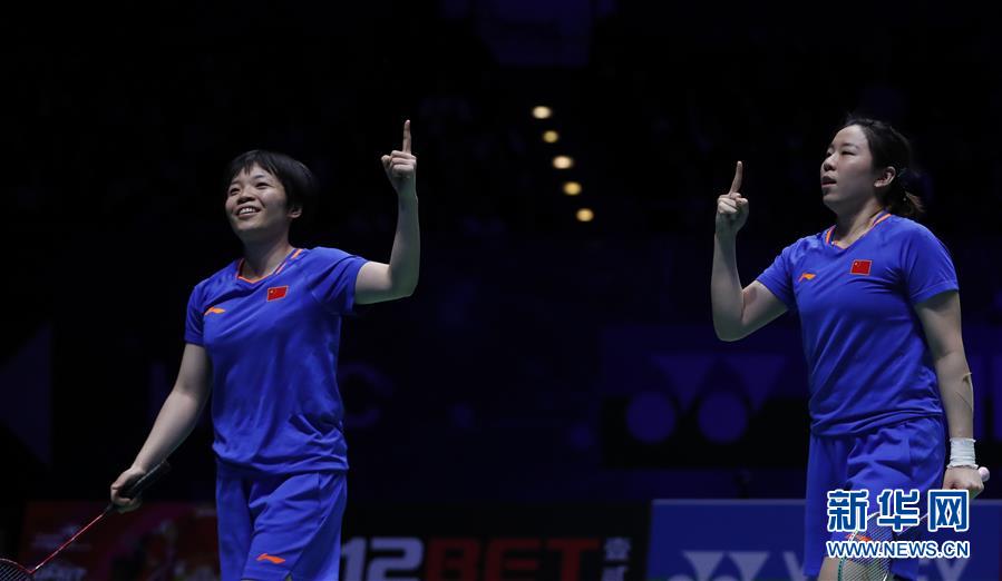 3月10日,中国选手陈清晨/贾一凡(右)在比赛中。 当日,在英国伯明翰进行的2019全英羽毛球公开赛女双决赛中,中国选手陈清晨/贾一凡以2比1战胜日本选手松本麻佑/永原和可那,夺得冠军。 新华社记者韩岩摄