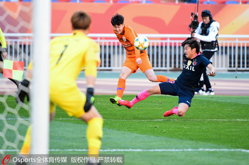 第81分钟,鲁能前场右路定位球开到禁区,刘洋前点鱼跃冲顶攻门,皮球被鹿岛鹿角门将扑住。