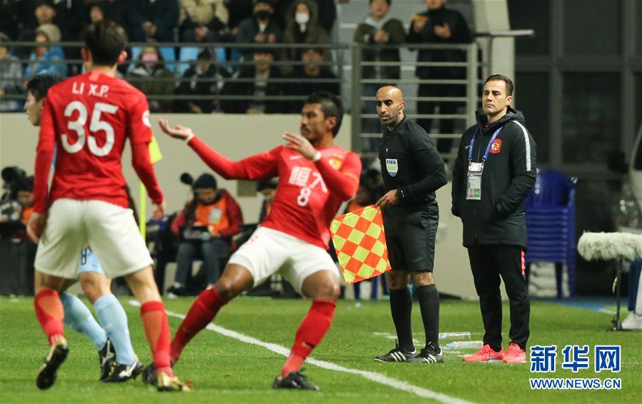 3月12日,广州恒大淘宝队主教练卡纳瓦罗(右一)在比赛中。 当日,在韩国大邱举行的2019年亚冠联赛小组赛F组第二轮比赛中,广州恒大淘宝队客场以1比3不敌大邱队。 新华社记者王婧嫱摄