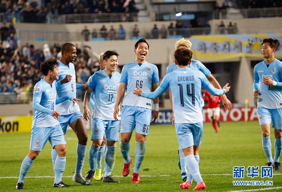 3月12日,大邱队球员在比赛中庆祝进球。 当日,在韩国大邱举行的2019年亚冠联赛小组赛F组第二轮比赛中,广州恒大淘宝队客场以1比3不敌大邱队。 新华社记者王婧嫱摄