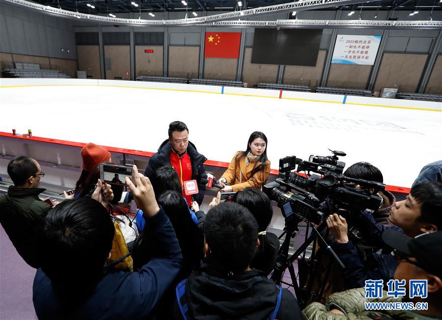 3月12日,中国花样滑冰队总教练赵宏博(后左)接受媒体采访。 当日,中国花样滑冰队在北京首钢园的国家冬季运动训练中心举行媒体公开课。2019年花样滑冰世界锦标赛将于3月18日至24日在日本埼玉举行。 新华社记者王丽莉摄