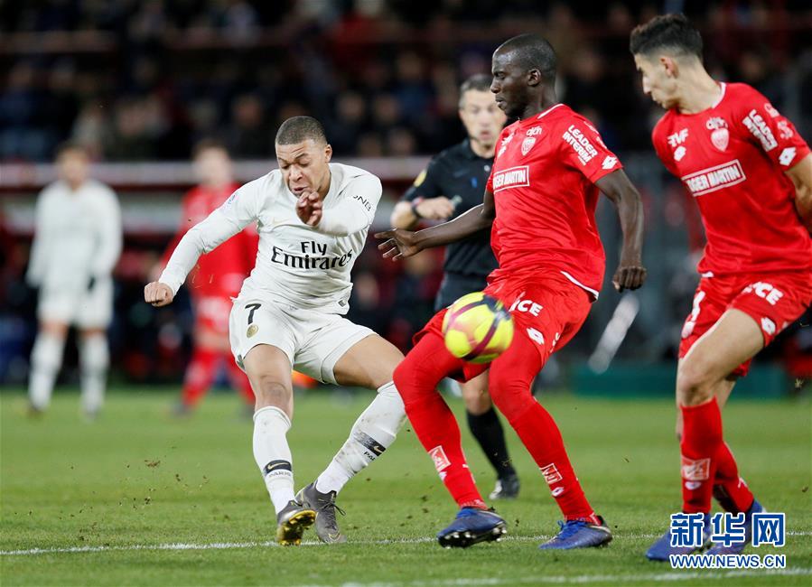 3月12日,巴黎圣日耳曼队球员姆巴佩(左)在比赛中射门。 当日,在2018-2019赛季法国足球甲级联赛第18轮的一场补赛中,巴黎圣日耳曼队客场以4比0战胜第戎队。 新华社/路透社