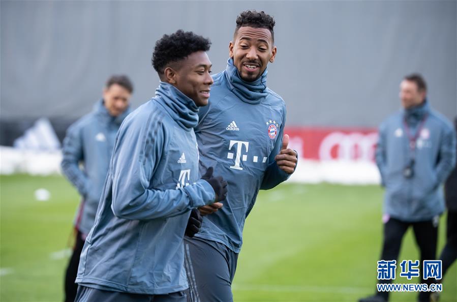 拜仁慕尼黑队球员博阿滕(前右)与阿拉巴在训练中交谈。新华社发