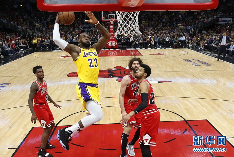 湖人队球员詹姆斯(左二)在比赛中扣篮。新华社/美联社