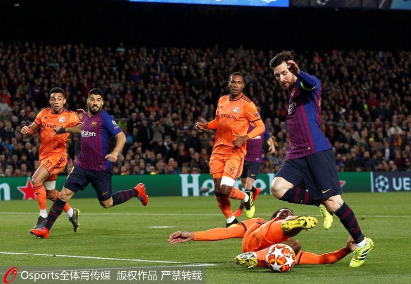 人民网北京3月14日电(欧兴荣)北京时间3月14日凌晨,2019欧冠联赛1/8决赛次回合继续展开角逐,巴塞罗那坐镇主场迎战里昂。上半场,苏亚雷斯禁区内被放倒,梅西随后主罚勺子点球首开纪录,苏亚雷斯助攻库蒂尼奥再下一城;下半场,萨尔胸部停球凌空抽射扳回一球,梅西带球一条龙低射打进网内,梅西随后连续助攻皮克、登贝莱进球。最终巴萨5-1大胜里昂,两回合比分5-1,昂首杀进欧冠八强。