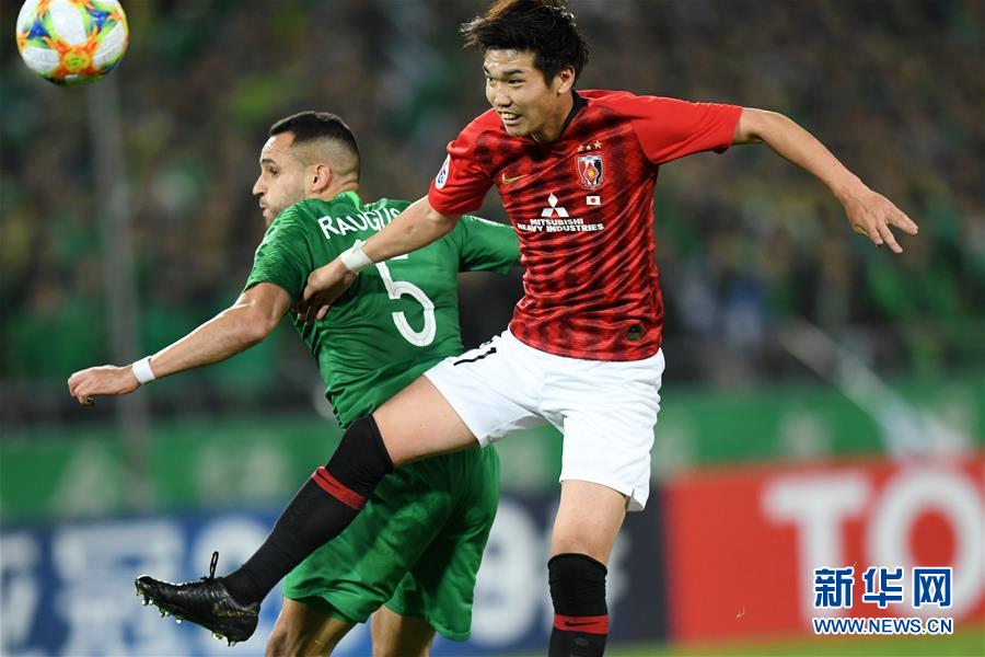 3月13日,北京中赫国安队球员奥古斯托(左)与浦和红钻队球员岩波拓也在比赛中拼抢。 当日,在北京进行的2019赛季亚洲冠军联赛G组小组赛第二轮比赛中,北京中赫国安队主场以0比0战平浦和红钻队。 新华社记者鞠焕宗摄
