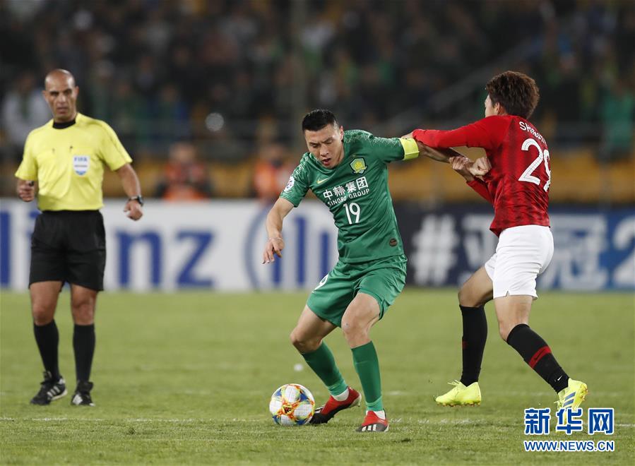 北京国安队球员于大宝(中)与浦和红钻队球员柴户海(右)在比赛中拼抢。新华社记者丁旭摄