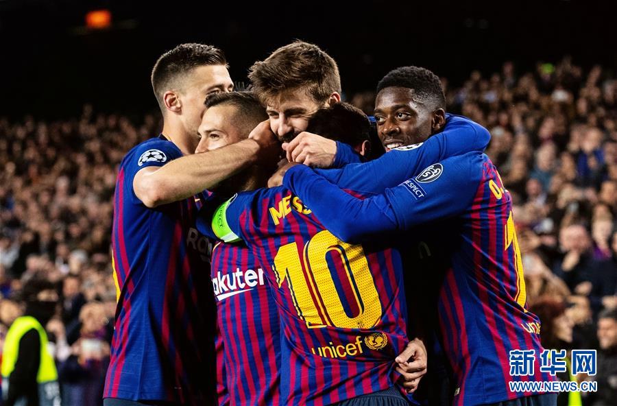 3月13日,巴塞罗那队球员皮克(中)进球后与队友庆祝。 当日,在2018-2019赛季欧洲足球冠军联赛1/8决赛次回合比赛中,西甲巴塞罗那队主场以5比1战胜法甲里昂队,因双方首回合以0比0战平,巴塞罗那队以总比分5比1晋级八强。 新华社发(胡安·戈萨摄)