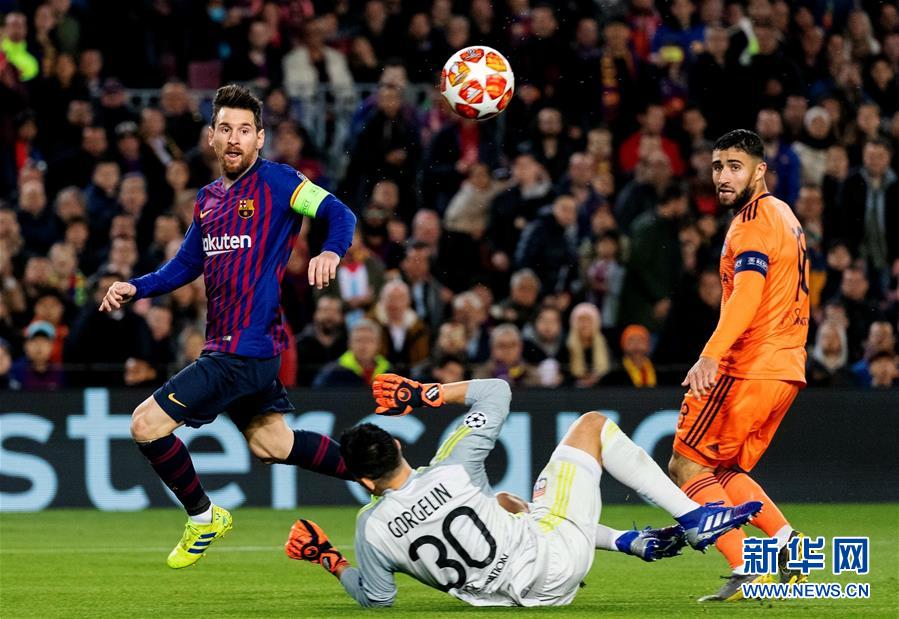 里昂队守门员马蒂厄·格戈林(中)防守巴塞罗那队球员梅西(左)的进攻。新华社发(胡安·戈萨摄)