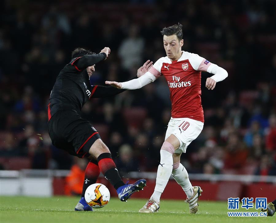 阿森纳队球员厄齐尔(右)与雷恩队球员格雷尼尔拼抢。新华社发