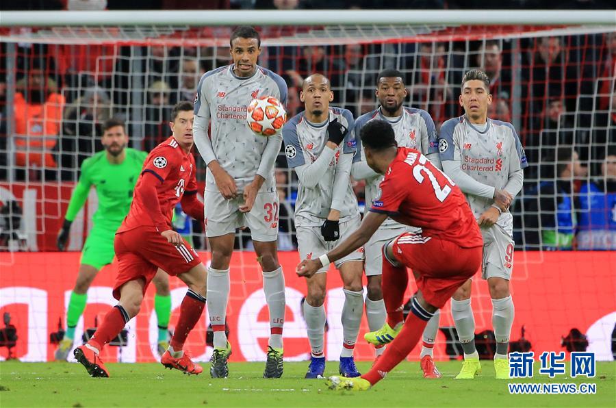 利物浦队球员马蒂普(后右四)、法比尼奥(后右三)、威纳尔杜姆(后右二)与菲尔米诺(后右一)在比赛中防守拜仁慕尼黑队球员阿拉巴(前)的任意球。新华社发